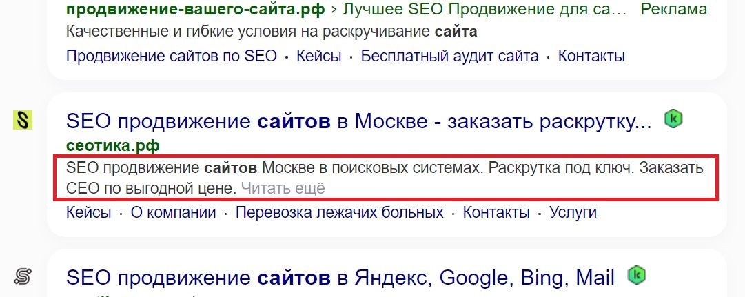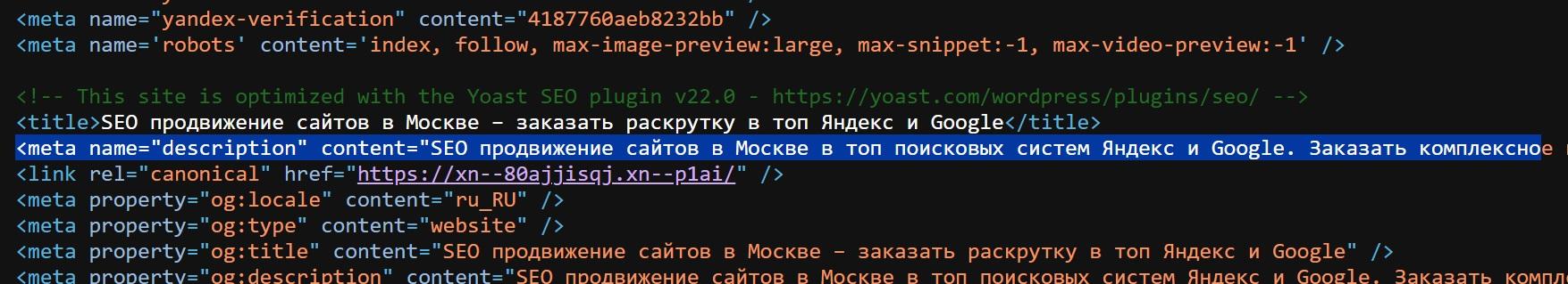 - Поискать ваш сайт или страницу в поисковой системе (например, Яндекс или Google) и посмотреть, как он отображается в результатах поиска. Обычно description идет под заголовком (title) в виде синего или черного текста.