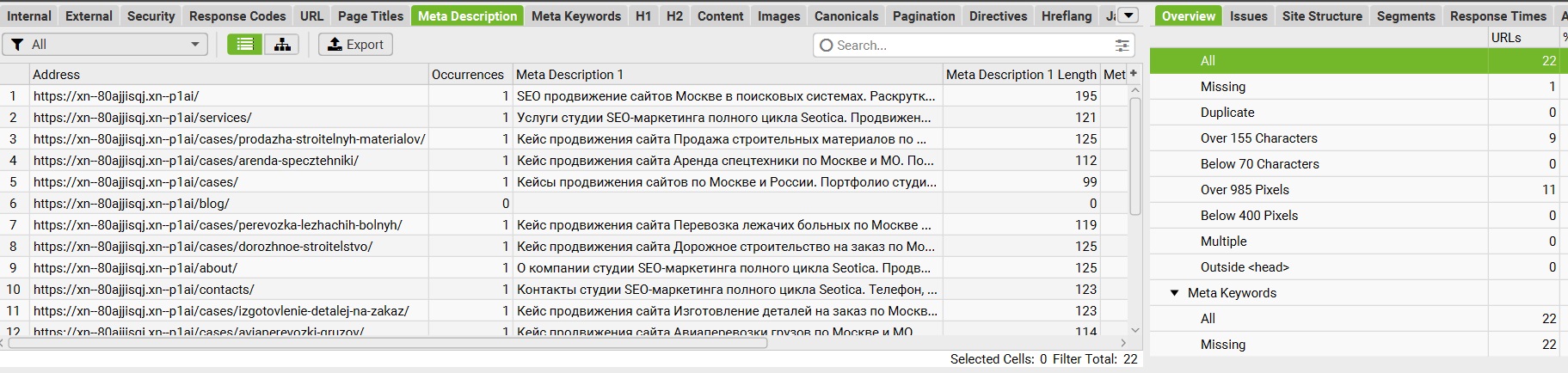 - Просмотреть список всех дескрипшнов, их параметры, такие как длина, пиксели, символы. Можно отфильтровать мета-описания по разным критериям, таким как дубликаты, пустые, слишком короткие или слишком длинные.