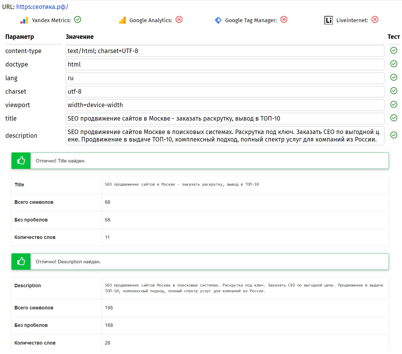 - Sitechecker — сервис, который анализирует дескрипшн на предмет дубликатов, пустот, длины, ключей.